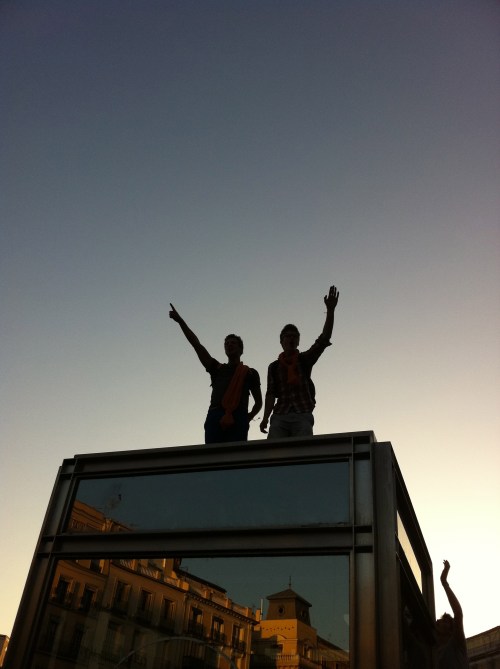 Nota para los quisquillosos: en la imagen. dos peregrinos subidos a una entrada de Cercanías en Sol y arengando al personal. Lo mismo pasaba al otro lado, pero esta foto me quedó mejor.